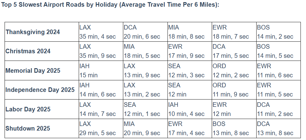 Holiday periods revealed stark regional divides, with summer 2025 events like Memorial Day showing half the airports improving 5-20% in travel times while others slowed 7-16%; Thanksgiving and Christmas 2024 amplified these gaps, as the slowest hubs like LAX took over 35 minutes per 6 miles—more than double the smoothest sites—compared to baselines.